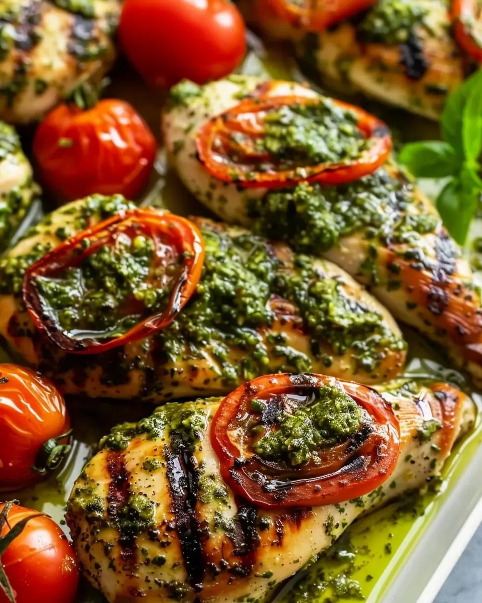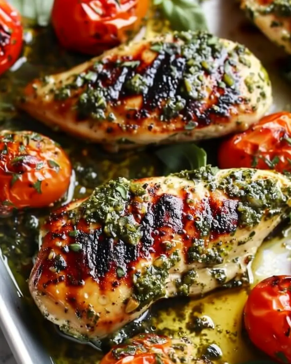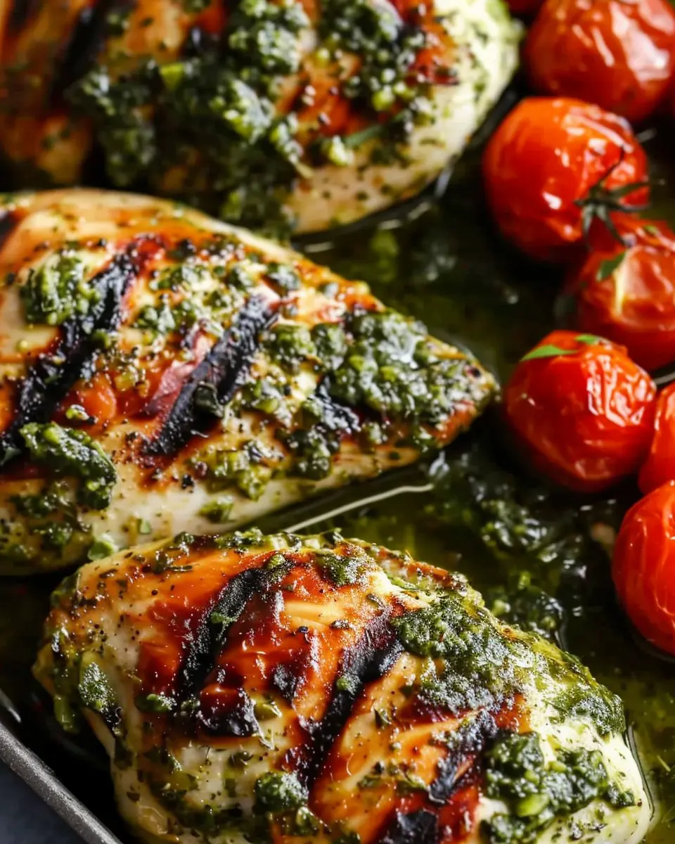- Grill or roast them for about 5-7 minutes until they’re slightly blistered. This step adds a burst of sweetness and acidity that contrasts perfectly with the rich pesto chicken.