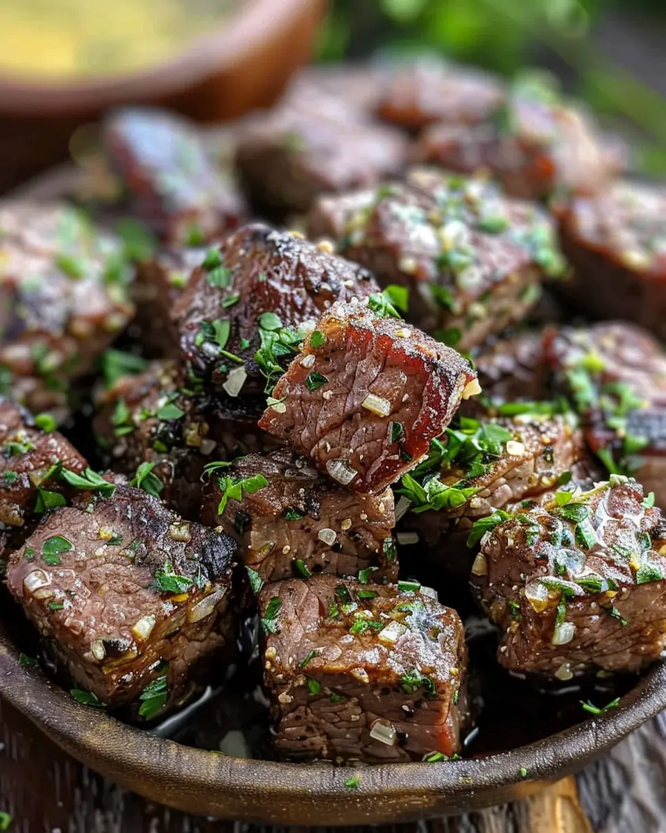 - Toss the hot steak cubes directly into the melted garlic butter.
