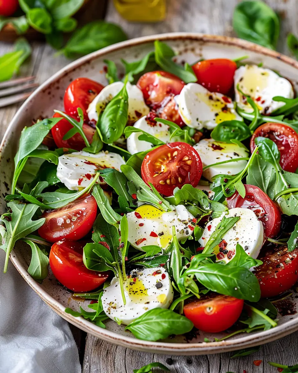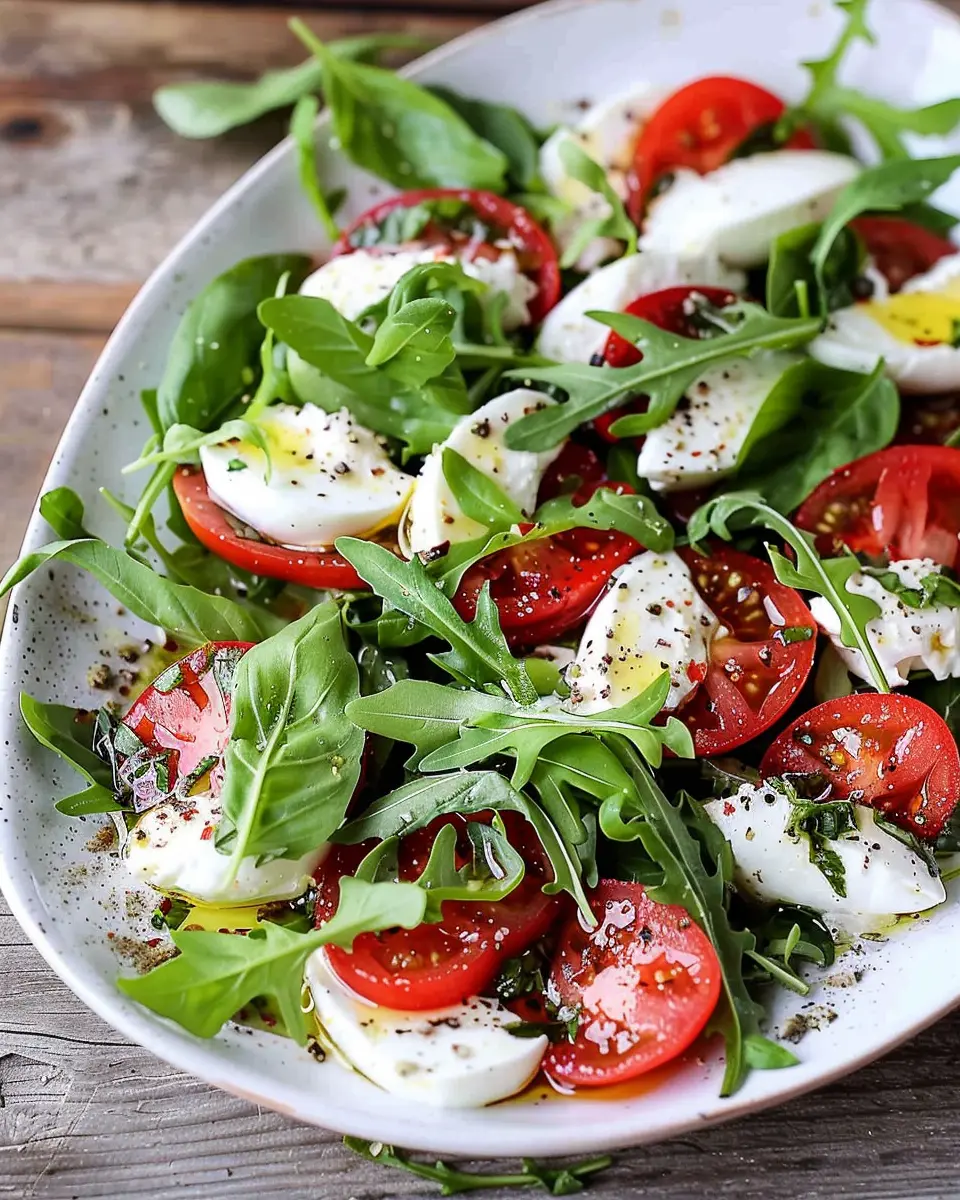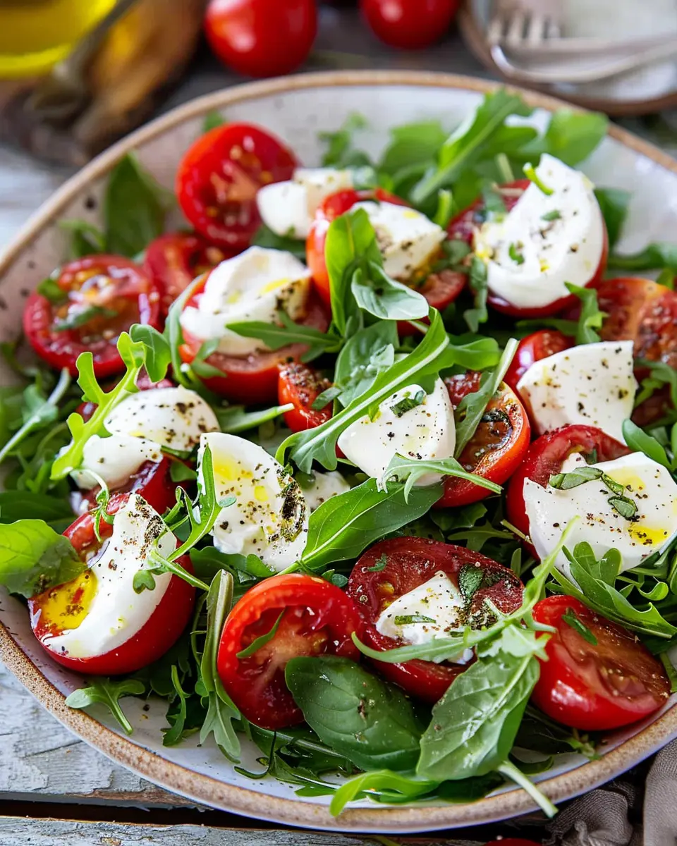 In summary, Arugula Caprese Salad combines fresh, vibrant flavors that make it a perfect choice for any season. The peppery notes of arugula dance beautifully with the creamy mozzarella and sweet tomatoes, creating a dish that is as pleasing to the palate as it is to the eye.