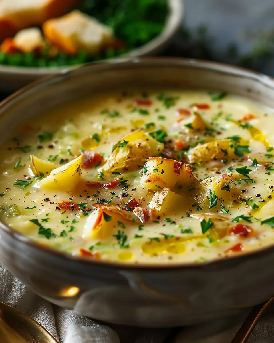 Hearty Cheddar Garlic Herb Potato Soup Recipe with Turkey Bacon