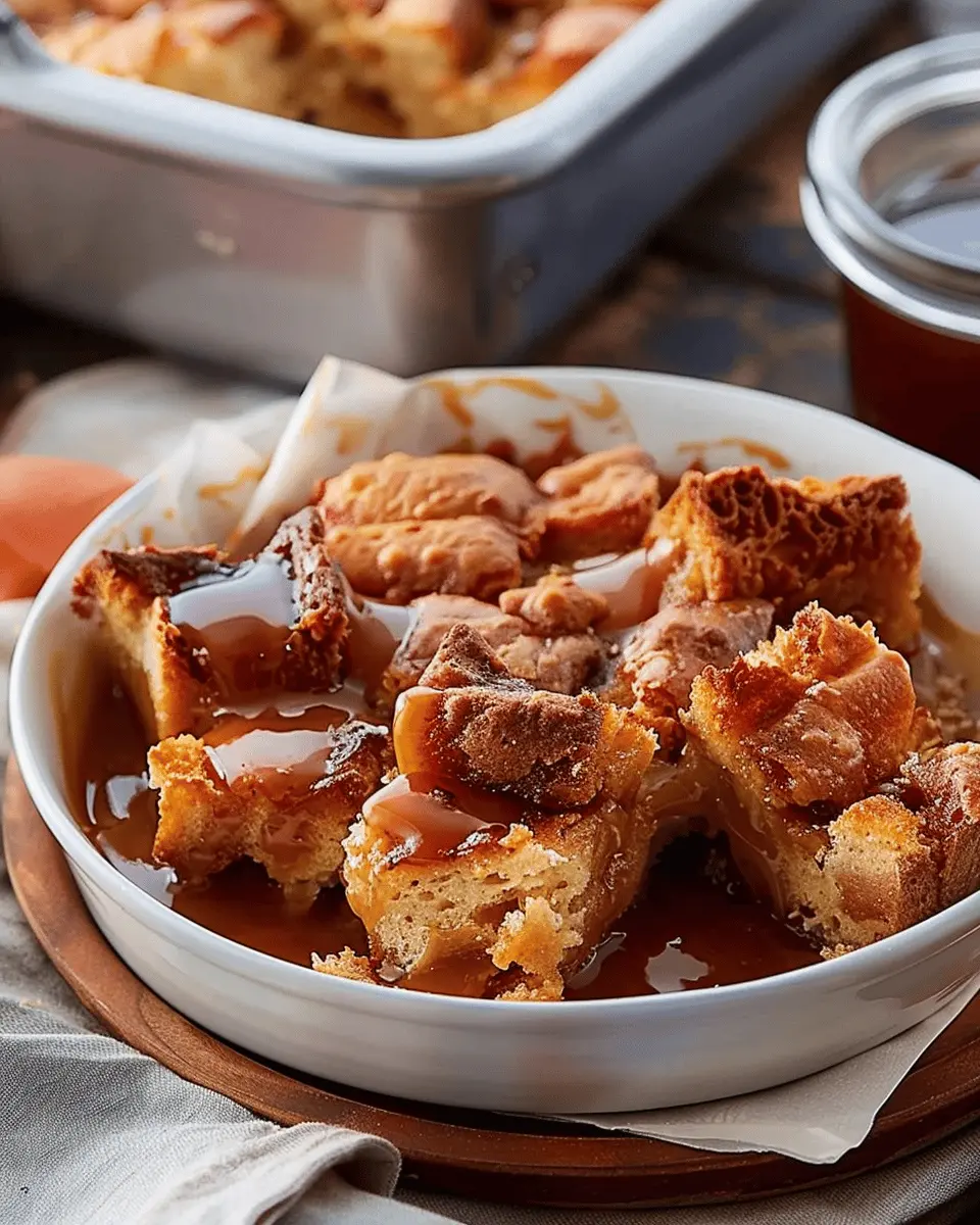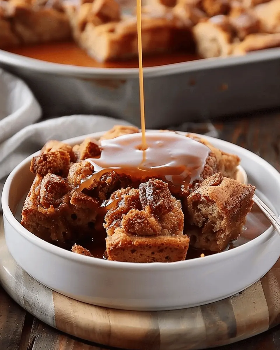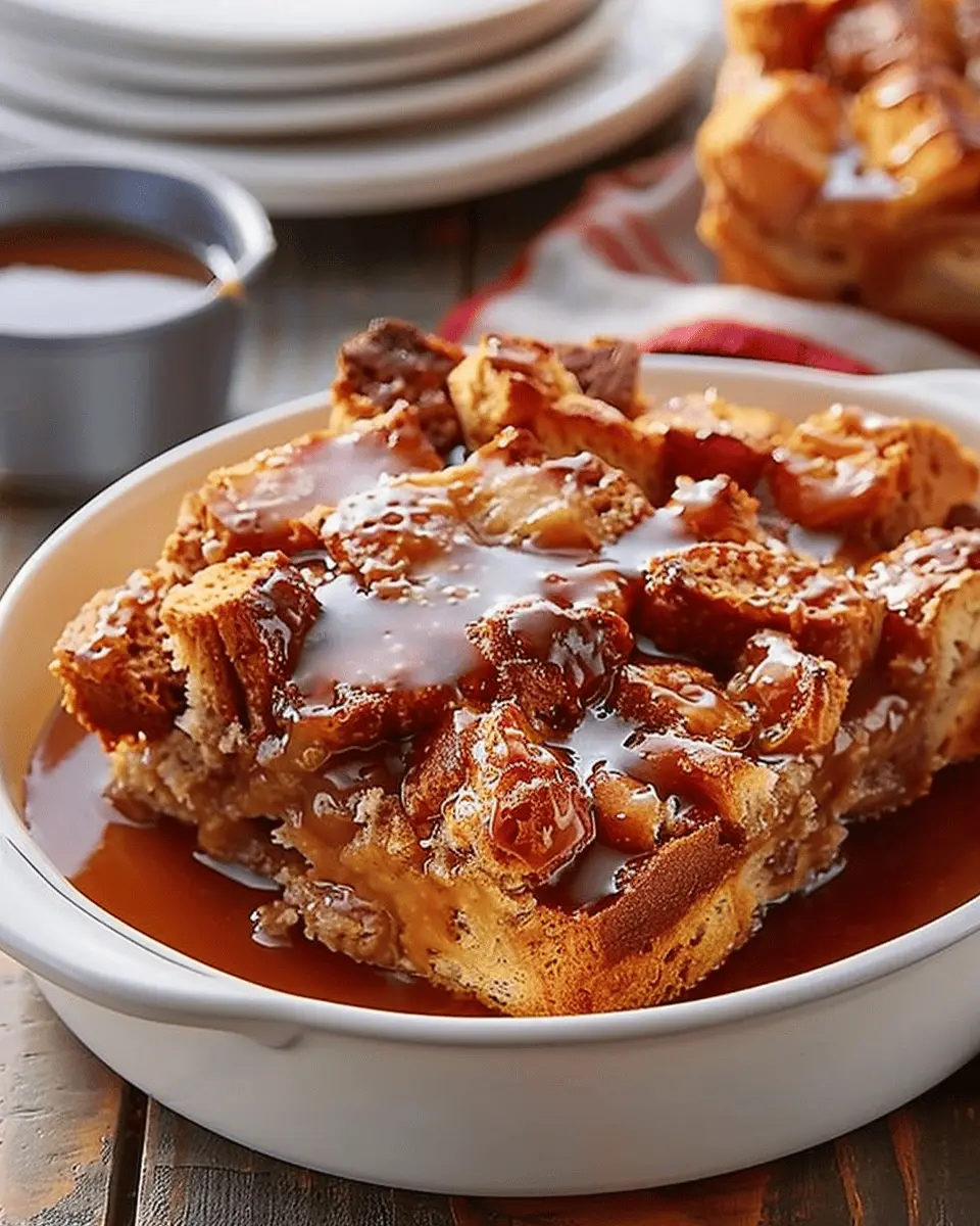 A delightful dessert that combines the rich flavors of bread pudding infused with whiskey and topped with a luxurious caramel sauce.