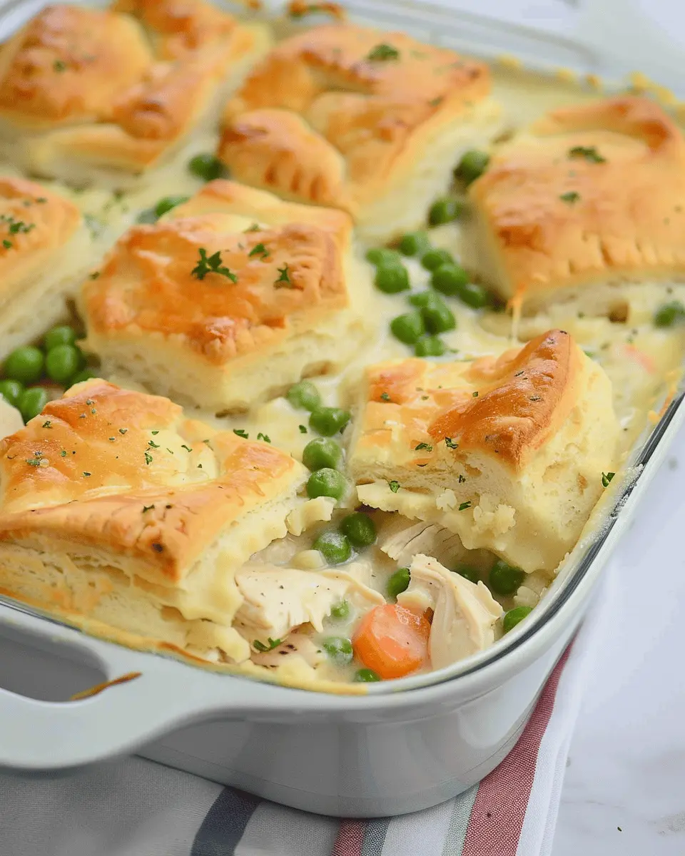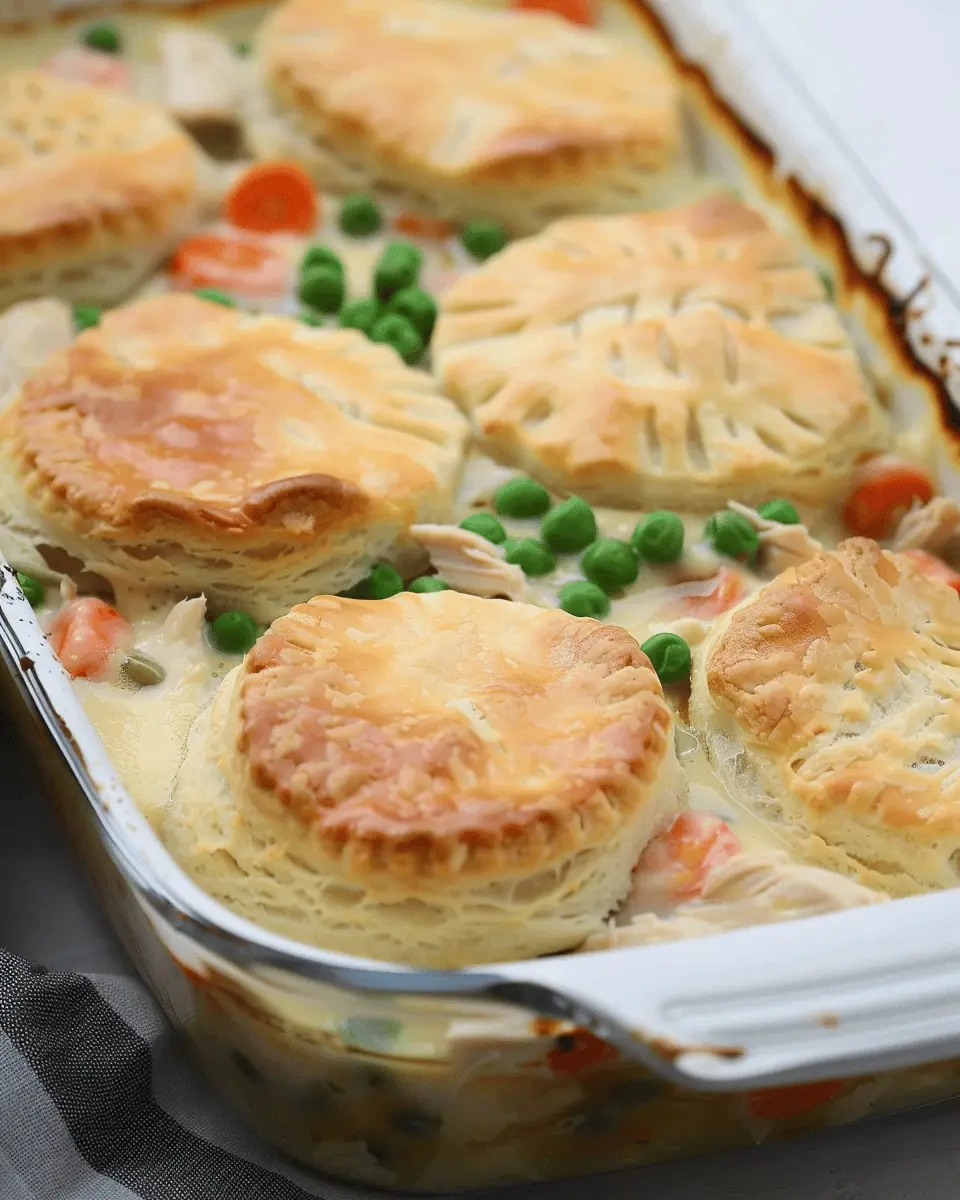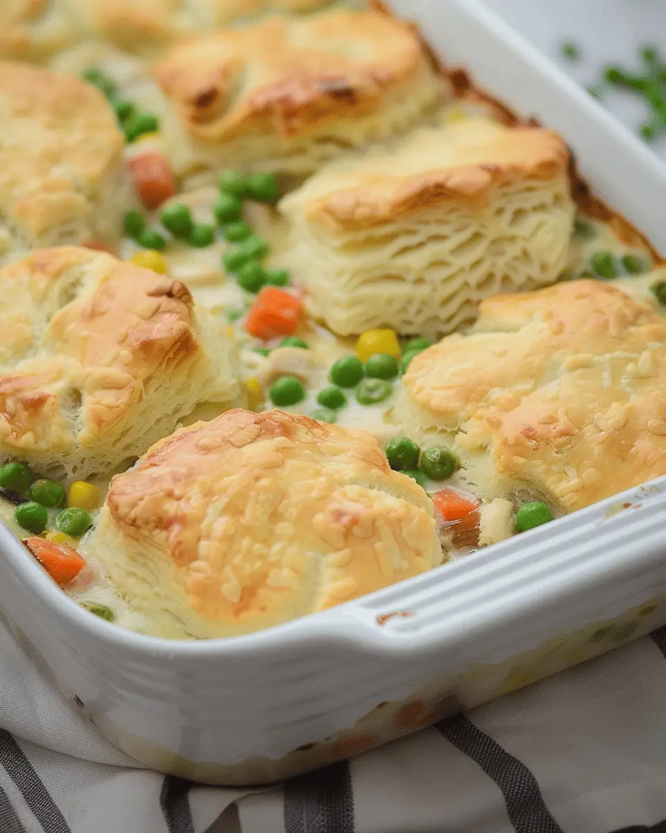 Enjoy this easy chicken pot pie casserole topped with fluffy biscuits for a comforting meal that’s perfect for any night of the week.