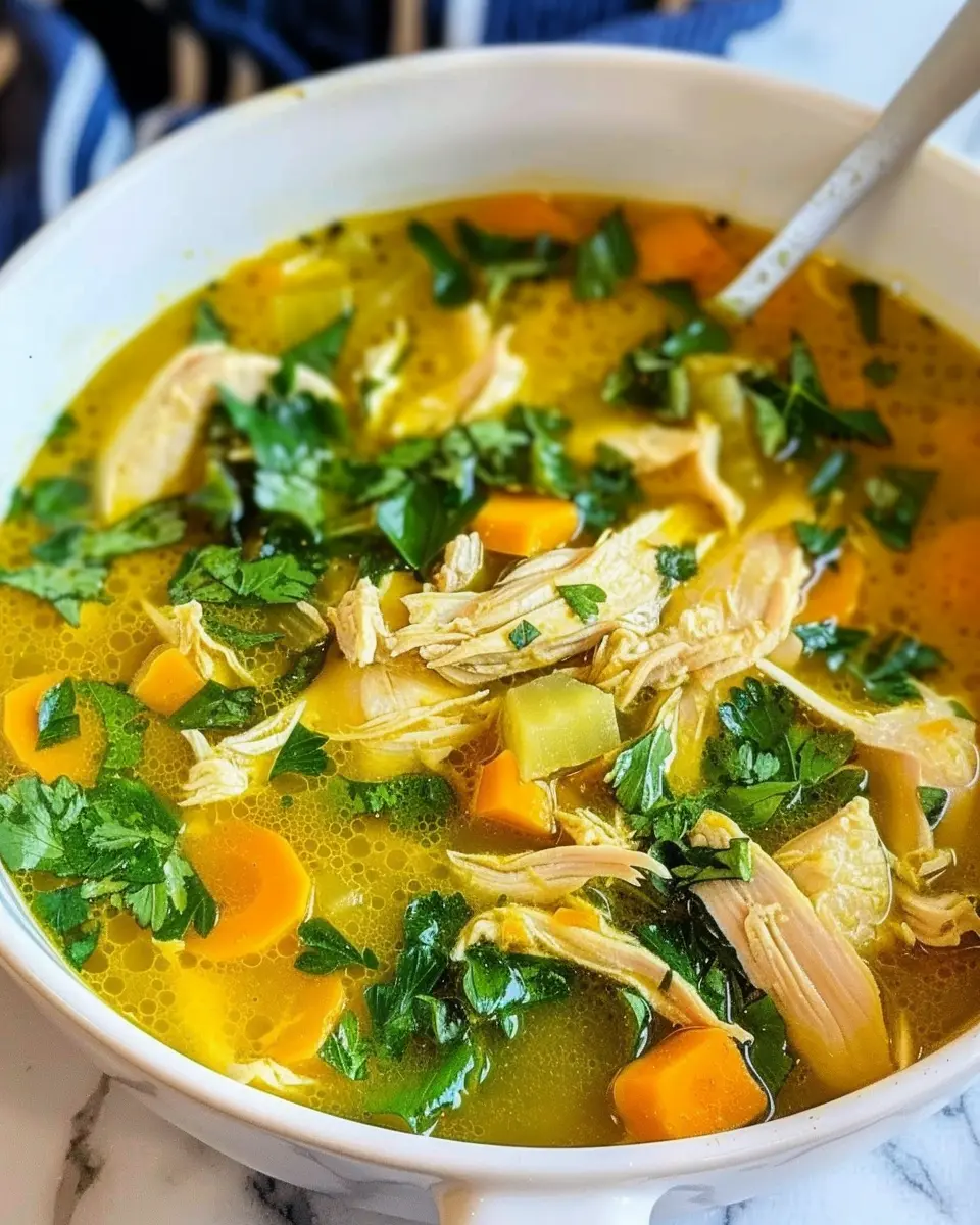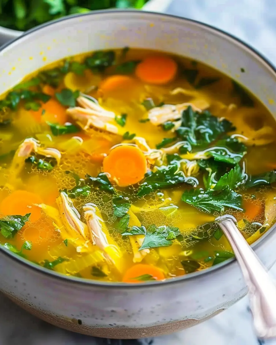 A warm and soothing chicken soup infused with ginger and turmeric, perfect for comfort and wellness.