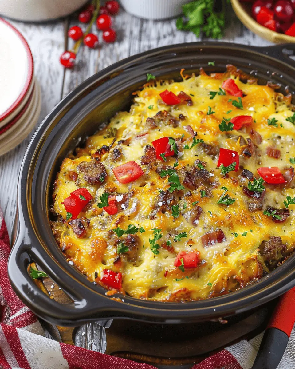 First things first, it’s essential to set up your crockpot properly. You want your Christmas Breakfast Crockpot Casserole to cook evenly and not stick, so be sure to grease the crockpot insert generously with cooking spray or an olive oil mist. If you prefer, you can line the bottom with parchment paper for easy cleanup later. Once that’s taken care of, set your crockpot to a low setting; this way, your casserole will be perfectly ready just in time for breakfast.