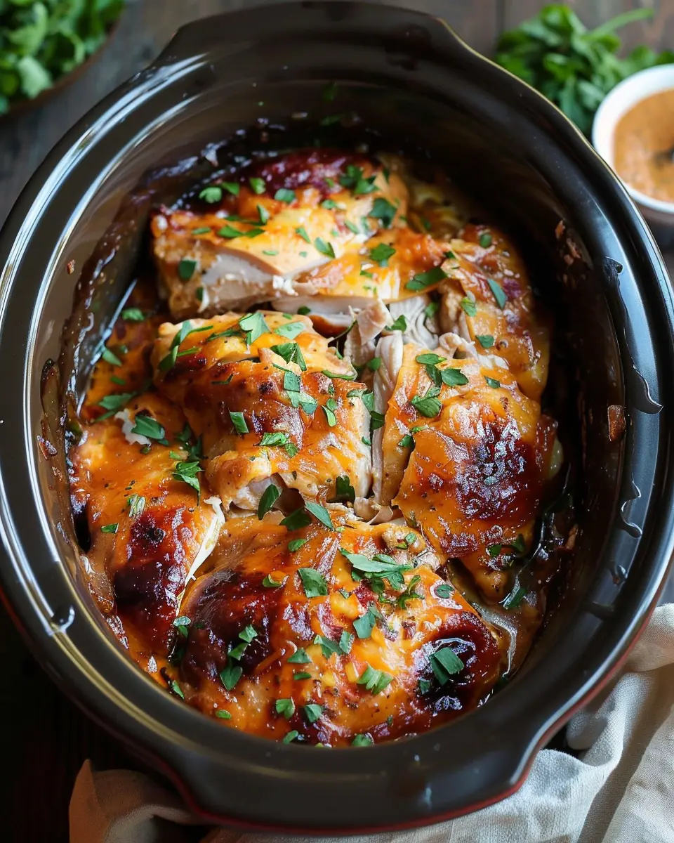 • Place the seasoned chicken thighs on the bottom of the crock pot.