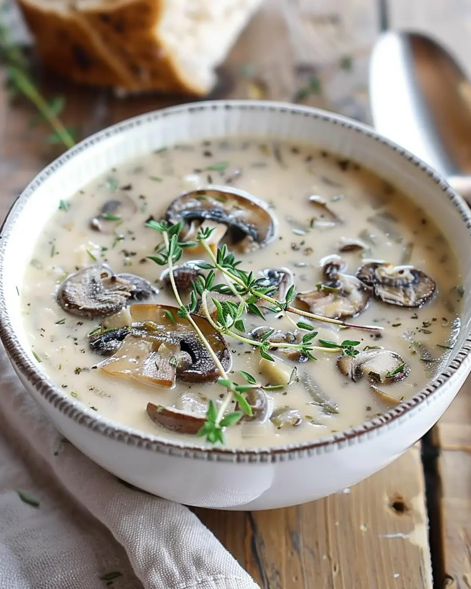 A rich and creamy soup that combines the earthy flavors of mushrooms with the savory taste of turkey bacon.