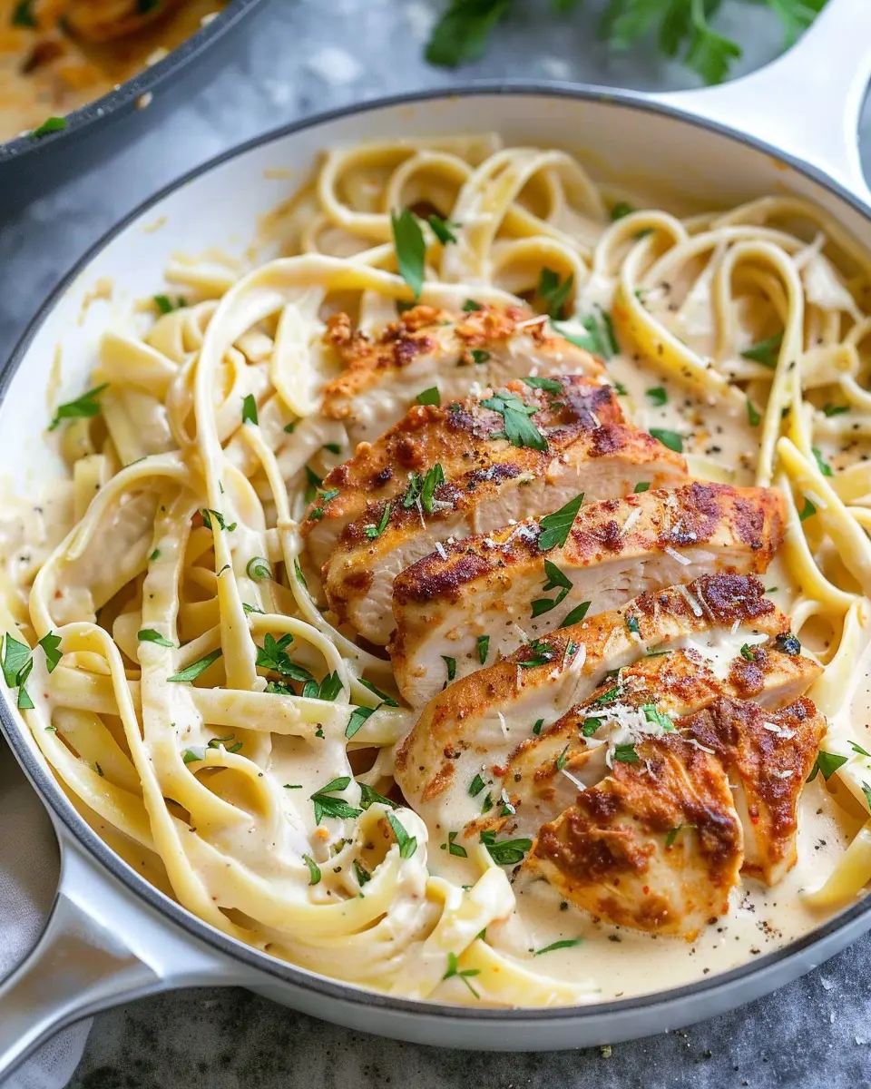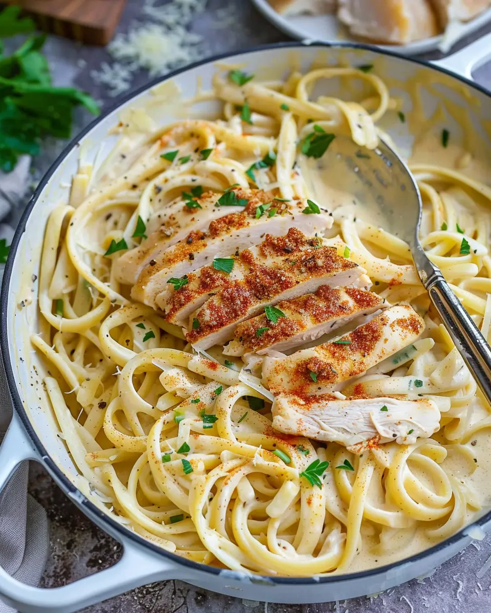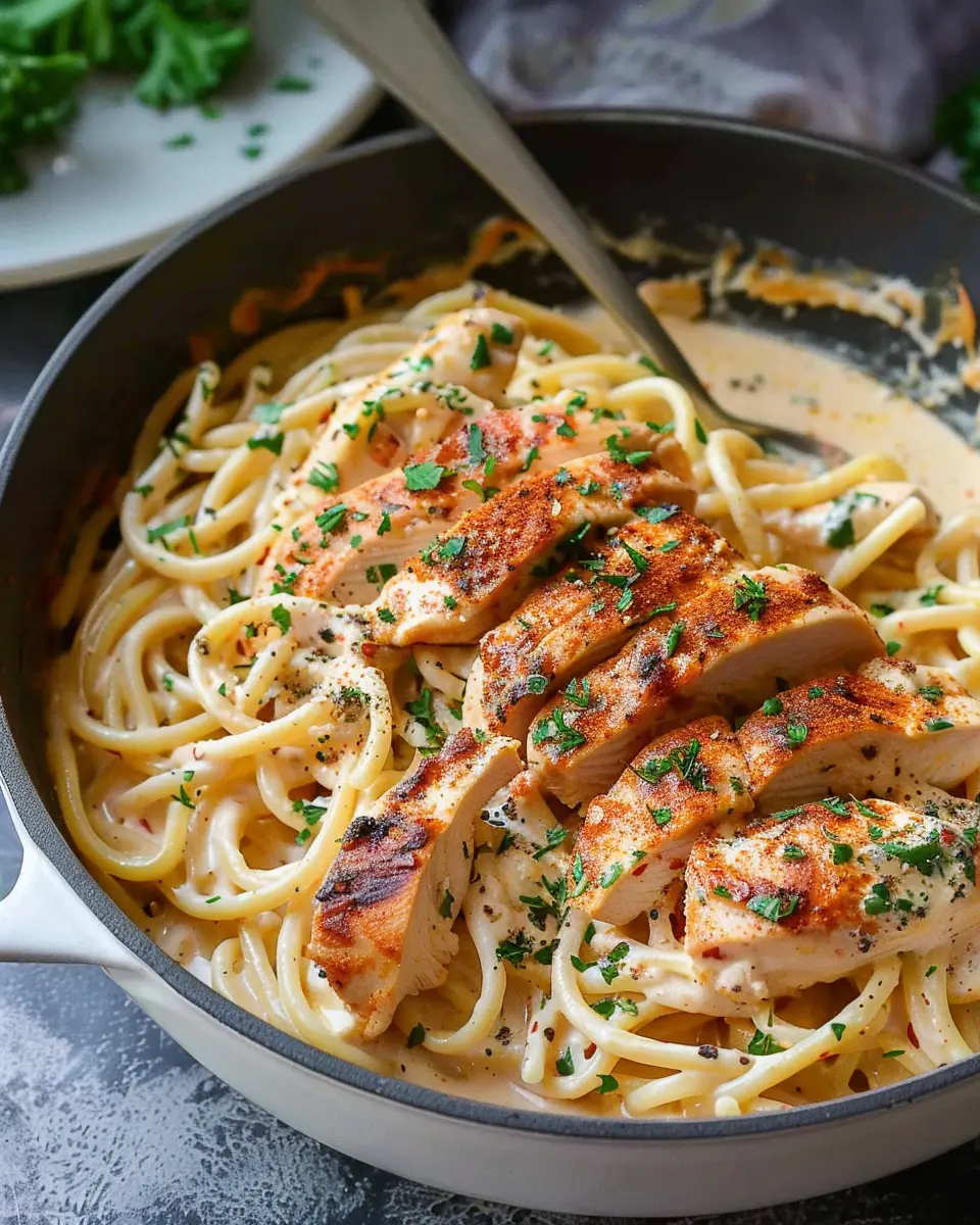 Once your pasta is cooked and drained, it’s time to unite everything. In the skillet, combine the cooked pasta, sliced chicken, and creamy sauce. Mix well—make sure every strand of pasta is coated with that gorgeous sauce. If the mixture feels too thick, add a splash more of the reserved pasta water until you reach your desired consistency.