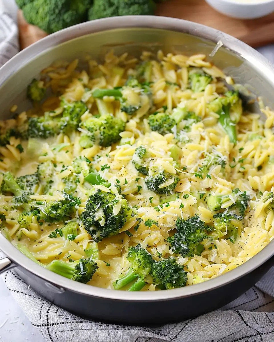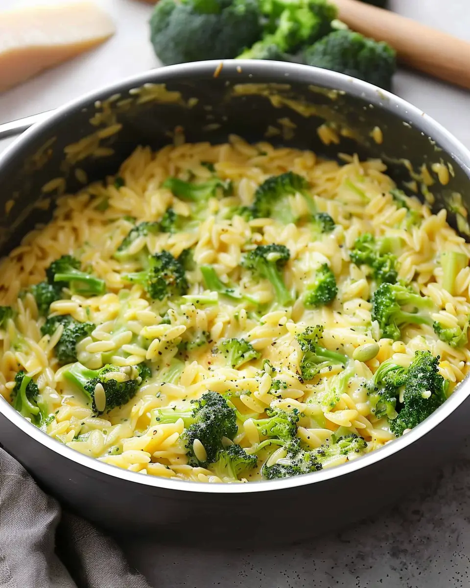 The magic happens in the pot! Cooking your creamy one-pot broccoli cheddar orzo takes around 20 minutes. Once you get everything simmering, the aromas will fill your kitchen, tempting everyone to gather around.