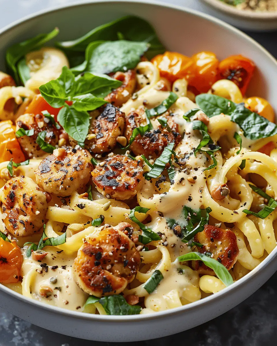 Time to amp up the protein in your creamy protein pasta bowl! Slice your chicken sausage (or turkey bacon) into bite-sized pieces and add it to the sautéed veggies. Cook for about 5 minutes or until the sausage is golden brown and infused with those delectable vegetable flavors.