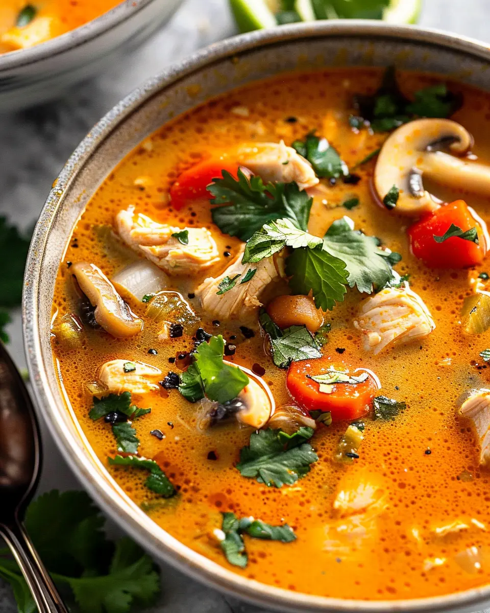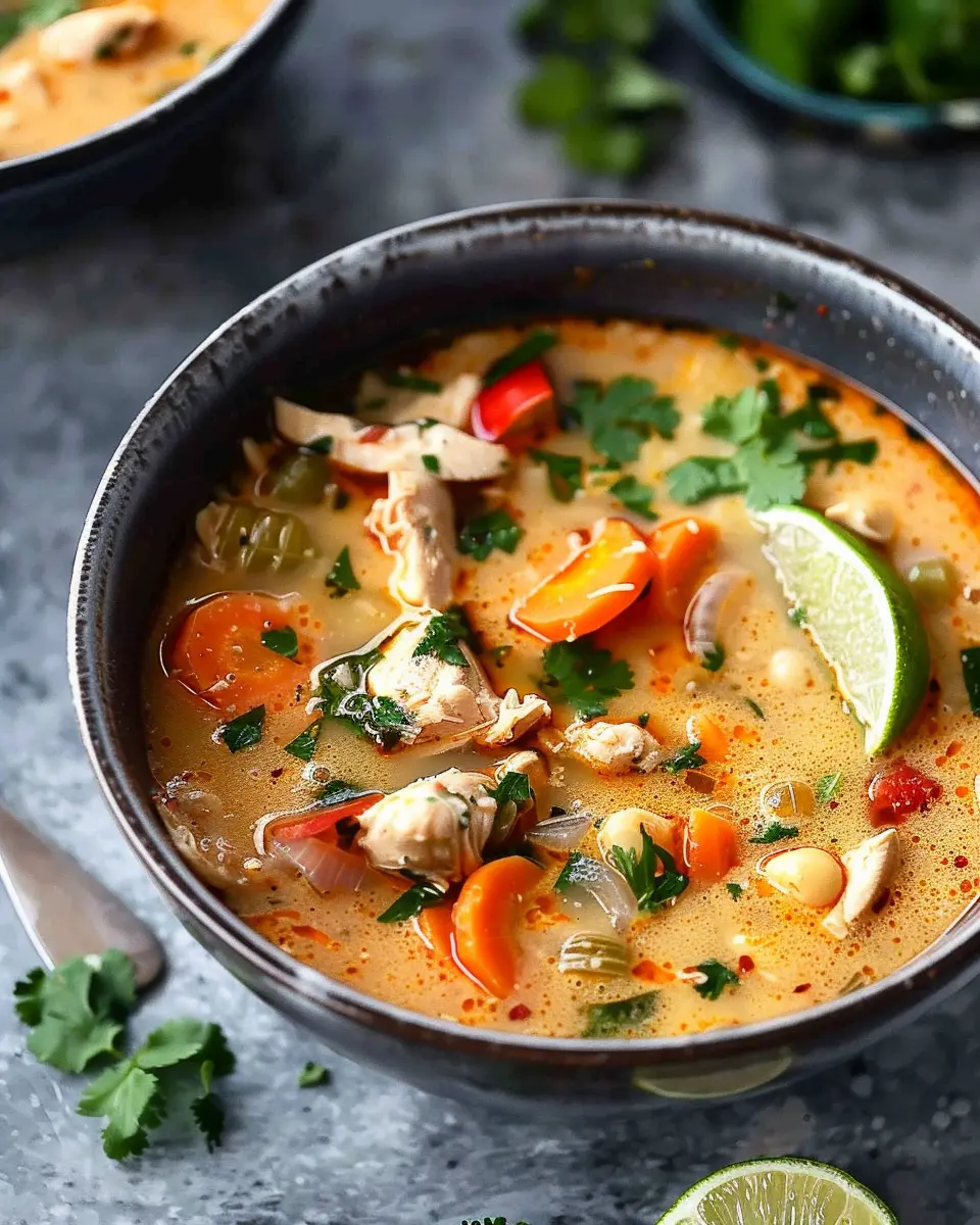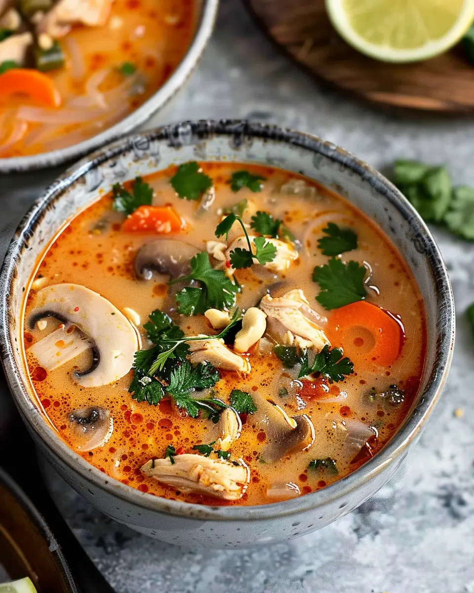 A warm and inviting bowl of Crockpot Thai Coconut Chicken Soup, perfect for a cozy night in.