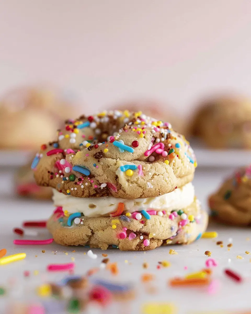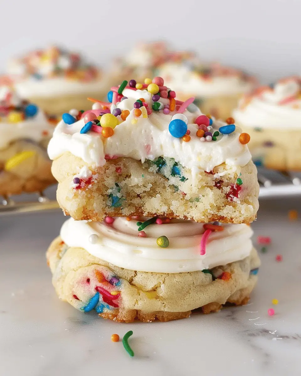 Now for the final and most delicious step—frosting the cookies! Using a spatula or a piping bag, generously spread or pipe the cake batter cream cheese frosting onto each cooled cookie. Don’t forget to sprinkle a few additional sprinkles on top for that festive flair!