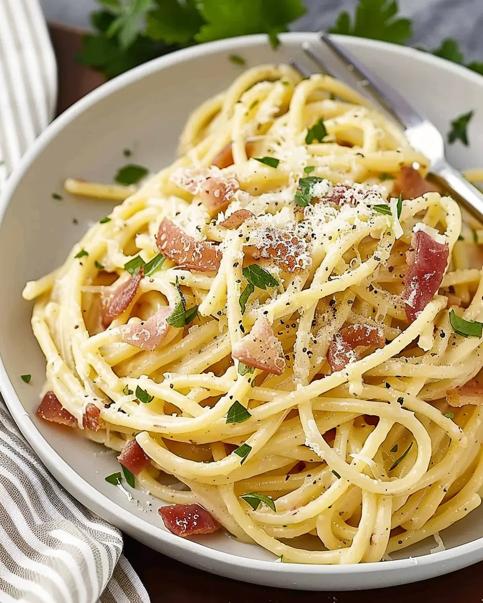 A delicious and easy recipe for spaghetti carbonara made with turkey bacon and chicken ham.
