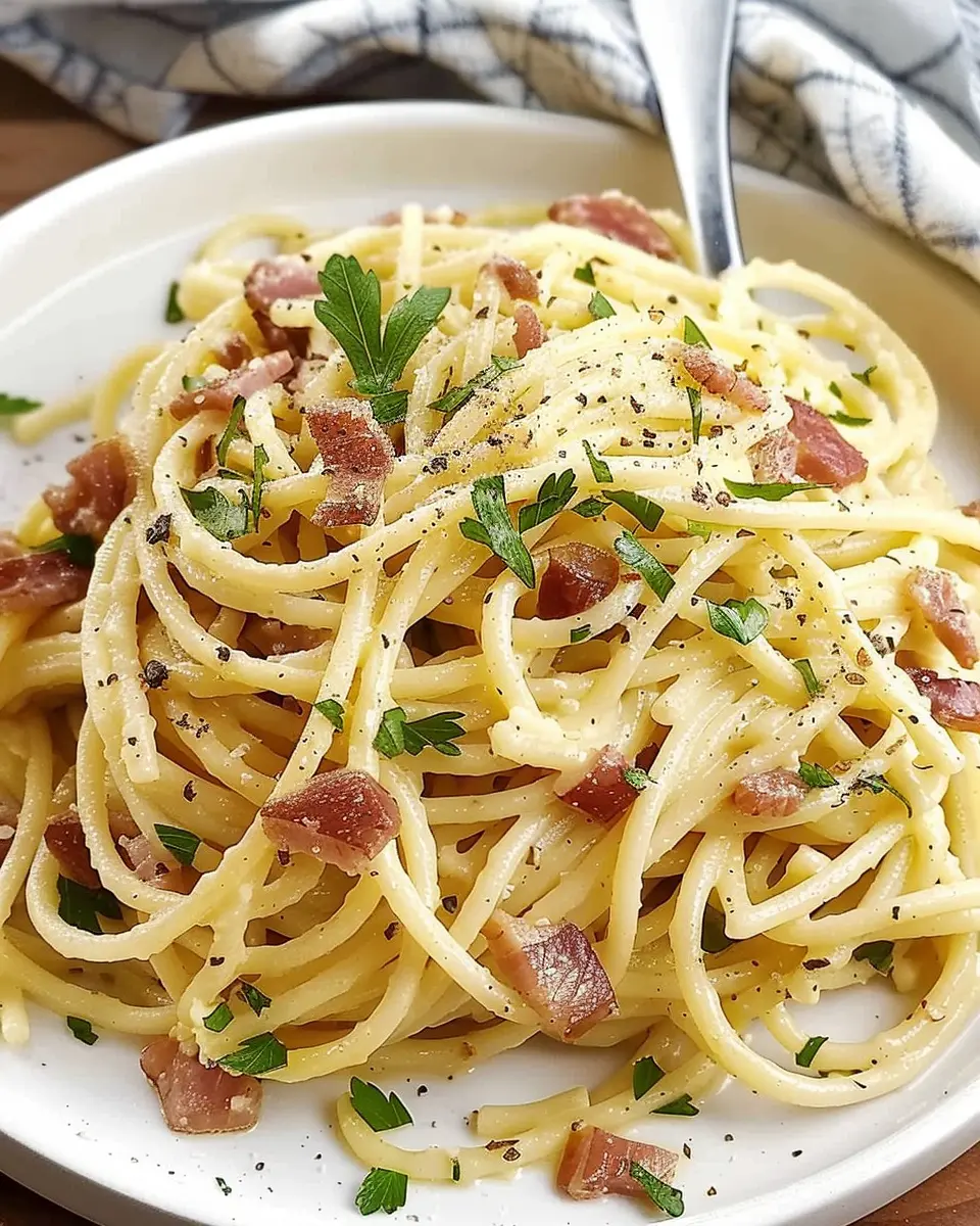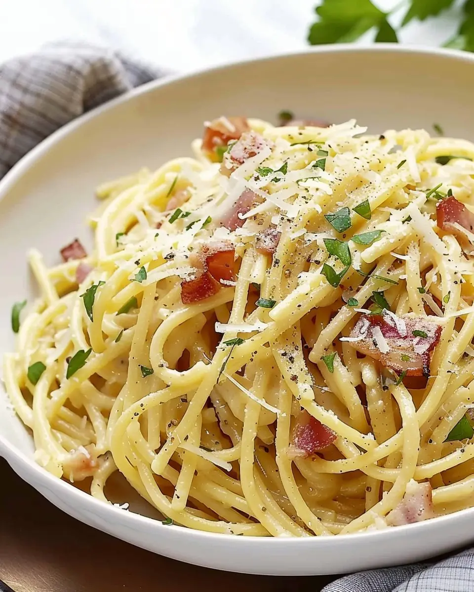 Plating can transform your easy spaghetti carbonara into a restaurant-worthy dish. For a classic look, use tongs to twist the pasta into a neat nest in the center of the plate. Garnish with freshly cracked black pepper and a sprinkle of Parmesan for that “chef’s kiss.” You can even add a touch of chopped parsley for a splash of color.