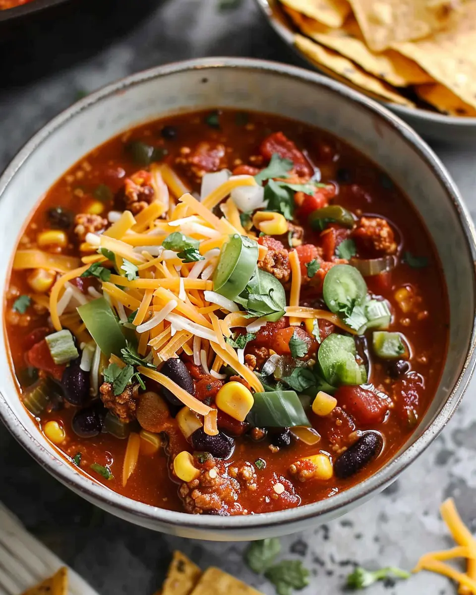 This Easy Taco Soup brings healthy ingredients together with the delicious flavor of turkey bacon, perfect for a comforting meal.