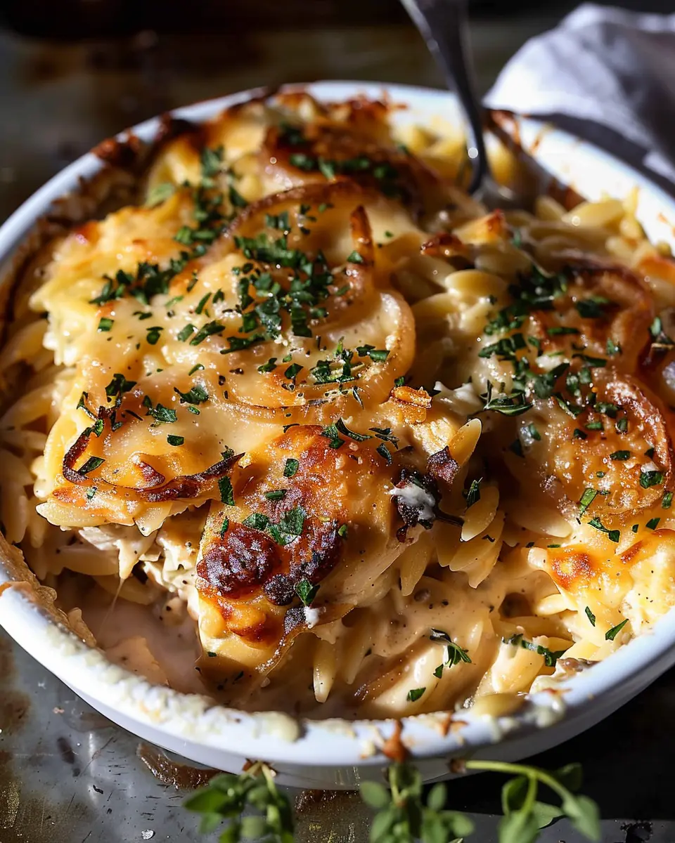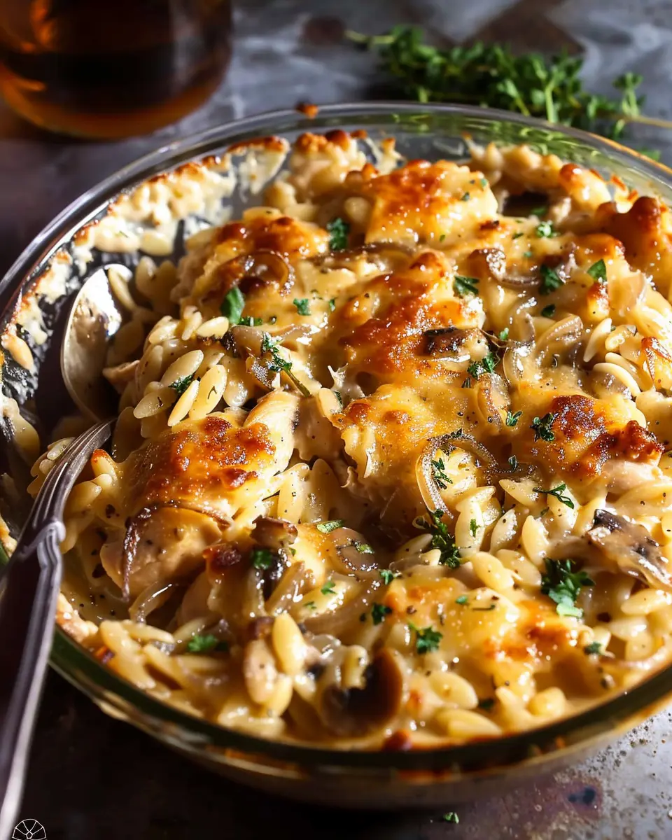 In summary, the French Onion Chicken Orzo Casserole is a delightful, comforting dish that brings together rich flavors and comforting textures in one cozy bowl. It’s perfect for busy weeknights or laid-back weekends with friends. With the savory aroma of caramelized onions and tender chicken blending seamlessly with creamy orzo, every bite feels like a warm embrace. Plus, substituting in turkey bacon or chicken ham keeps it lighter yet packed with flavor. So why not give this recipe a shot? You’ll impress your friends and come back for seconds! For more cozy recipes, check out this source for inspiration!