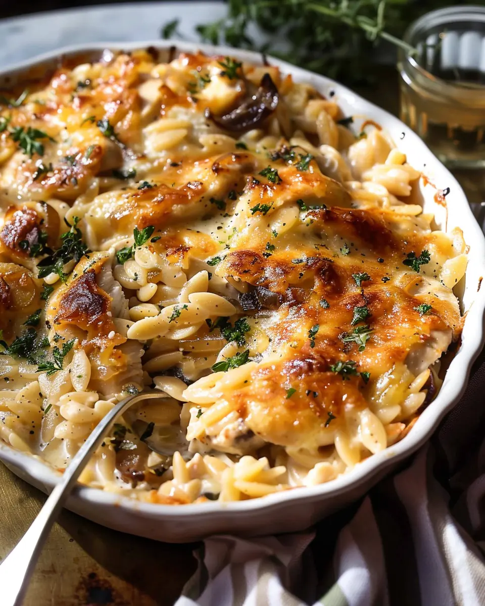 French Onion Chicken Orzo Casserole