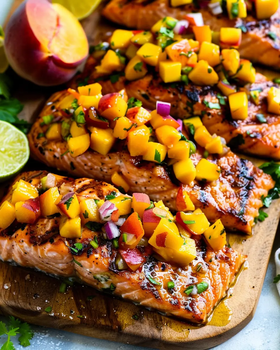In summary, Grilled Salmon with Mango Peach Salsa is not just a dish; it’s a celebration of flavors and health. The succulent salmon pairs beautifully with the vibrant sweetness of the mango and peach salsa, making it a perfect option for both busy weeknights and weekend gatherings. You’ll find that this recipe is not only easy to prepare but also a crowd-pleaser, allowing you to impress your friends and family without the fuss.