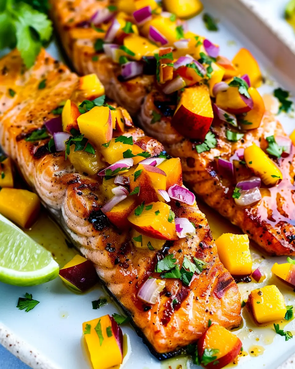 Grilled Salmon with Mango Peach Salsa is a refreshing dish perfect for summer gatherings, featuring juicy salmon paired with a vibrant fruit salsa.