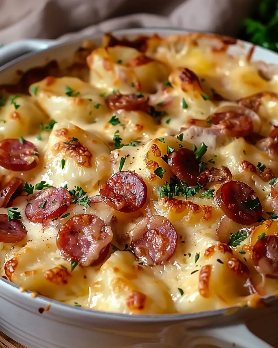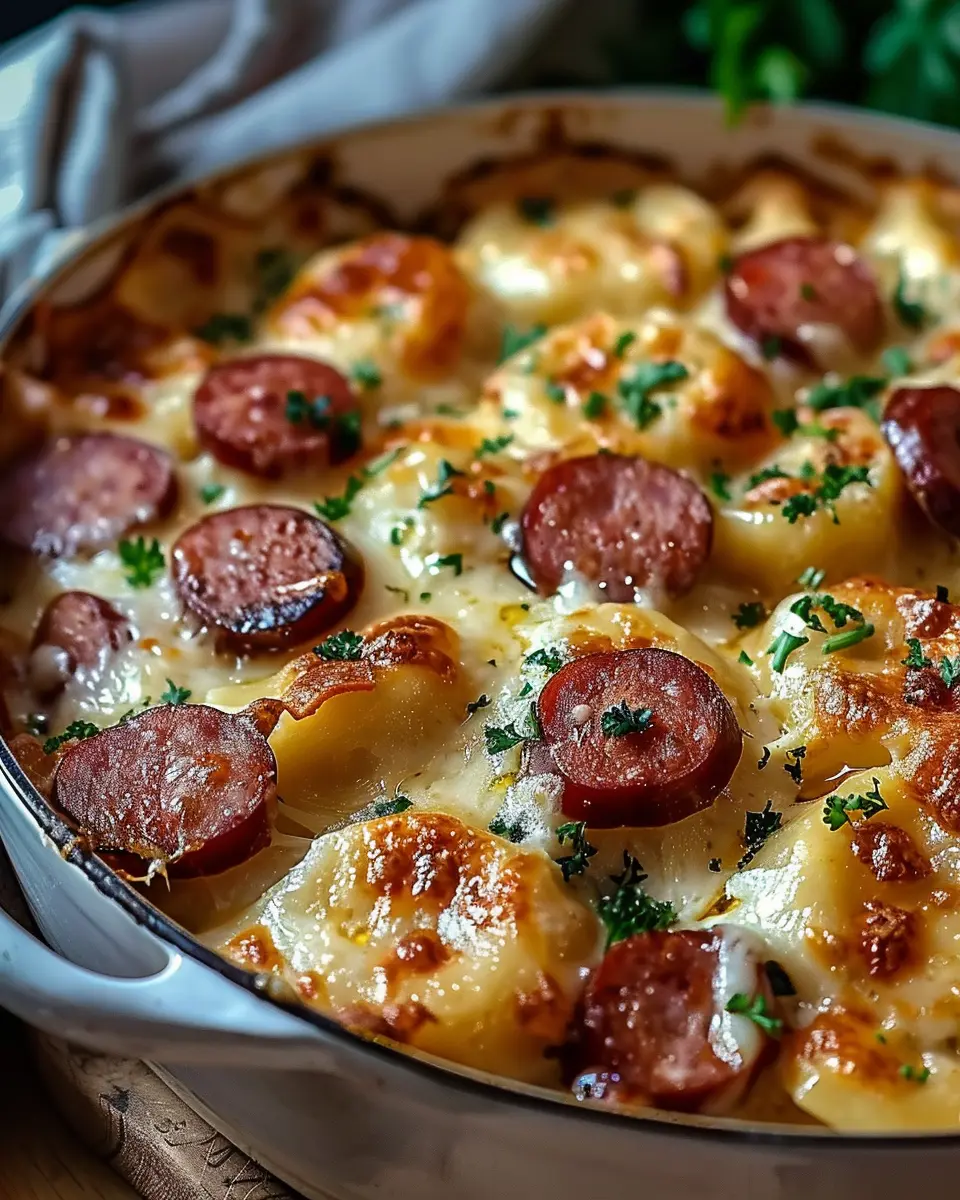 A comforting casserole combining pierogi and kielbasa, perfect for cozy dinners.