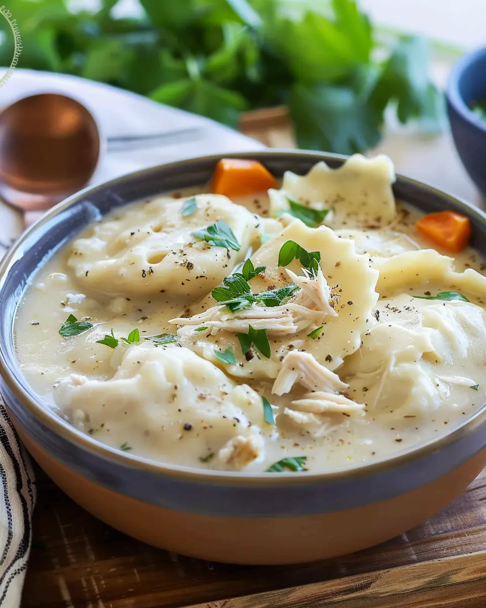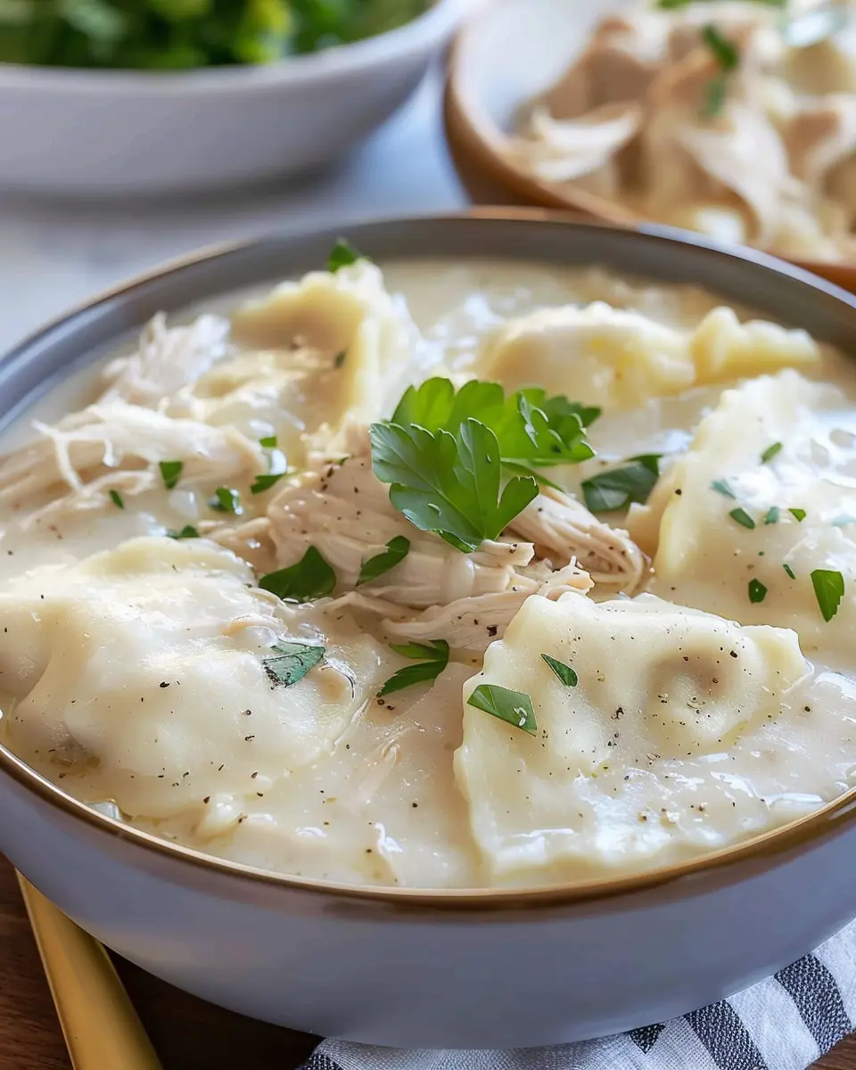 Enjoy a hearty bowl of homemade chicken and dumplings, the ultimate comfort food for any occasion.