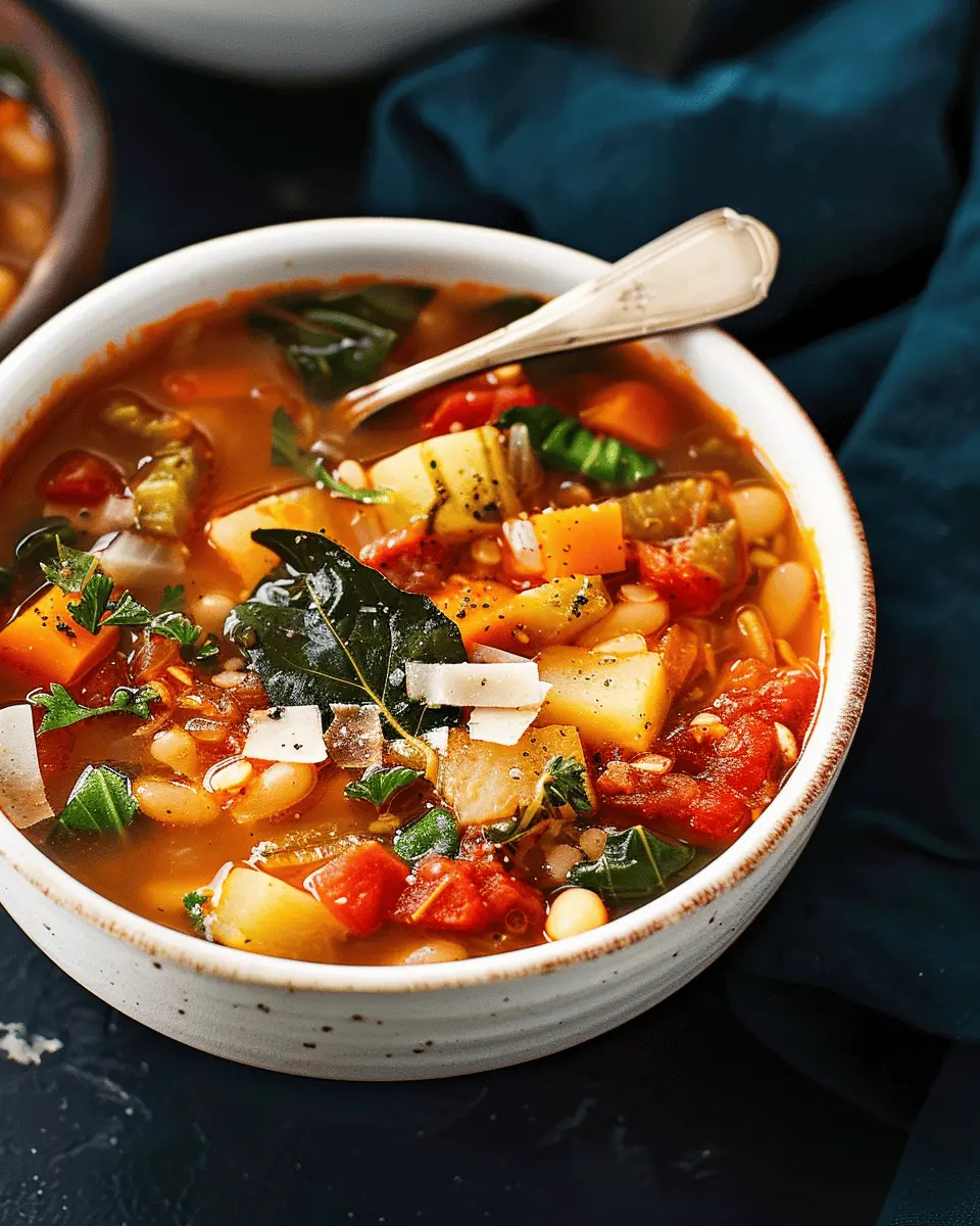 As your Italian Minestrone Soup nears completion, it’s time to elevate it to the next level. Stir in a couple of handfuls of fresh spinach or kale. This not only packs the soup with nutrients but also adds a beautiful pop of color. Once the greens have wilted, squeeze in some fresh lemon juice. This brings a bright finish to the rich, hearty flavors.