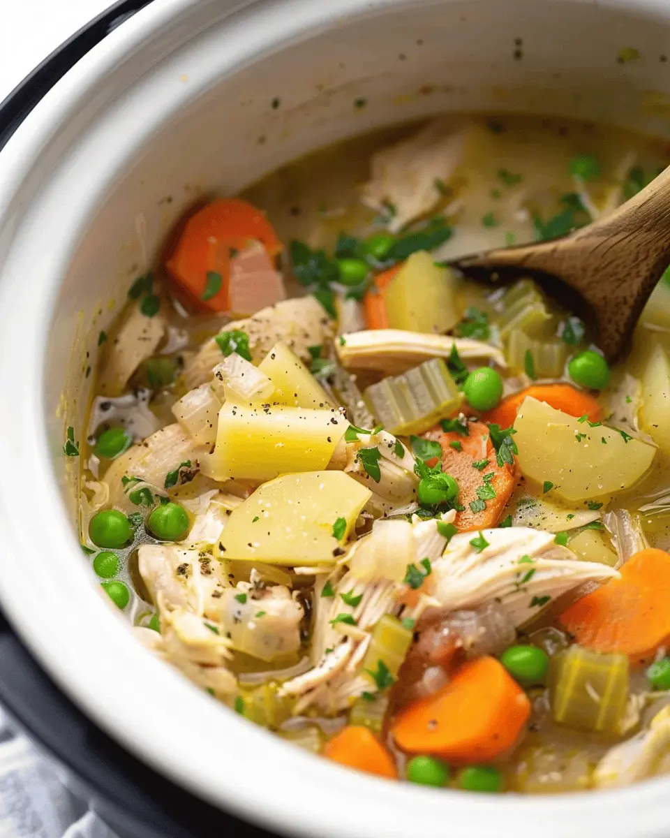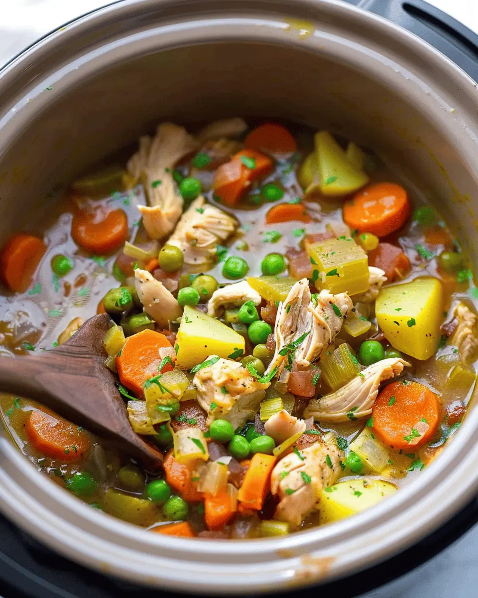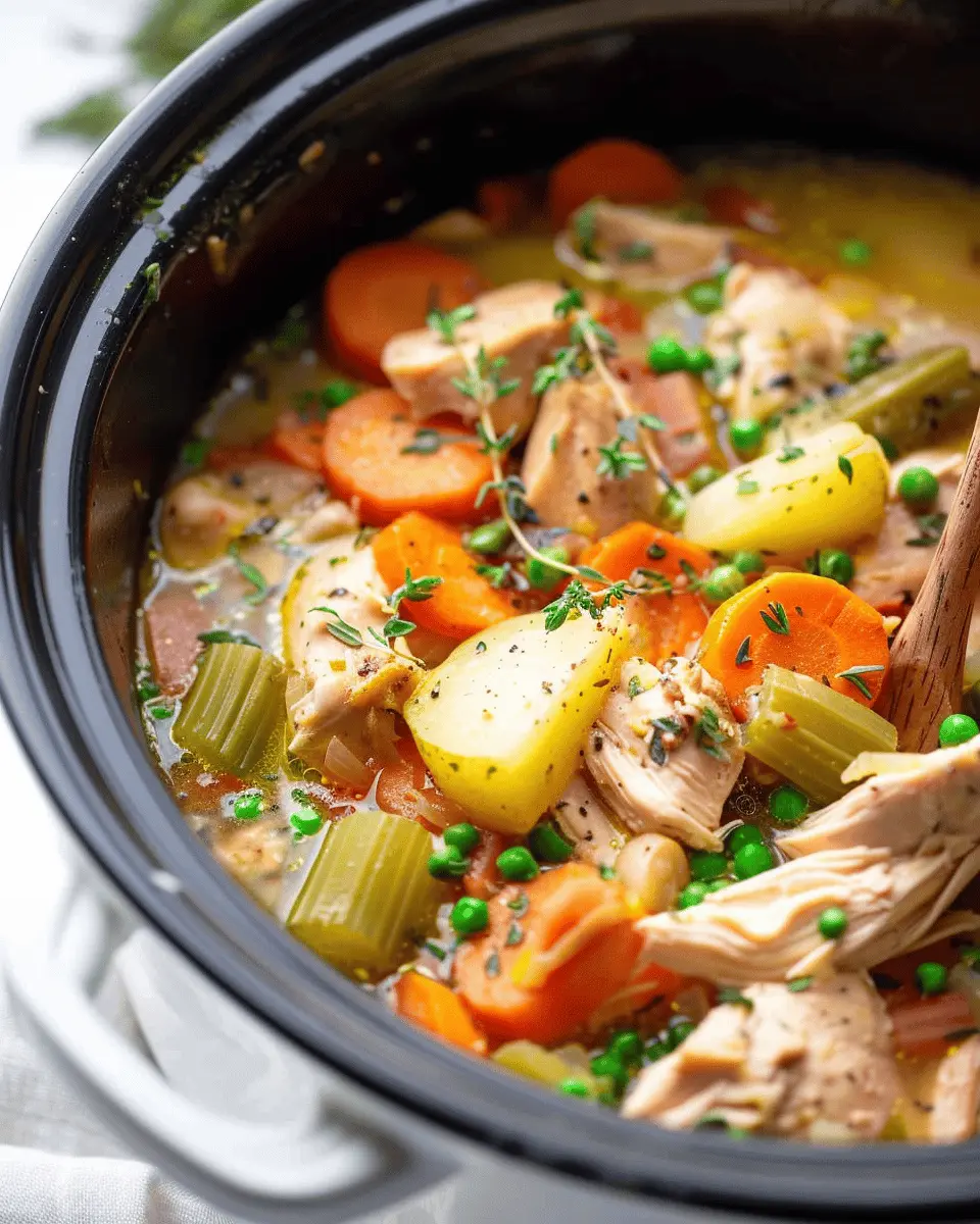 A delicious and healthy recipe for a comforting chicken and vegetable stew, made easy in a crockpot.