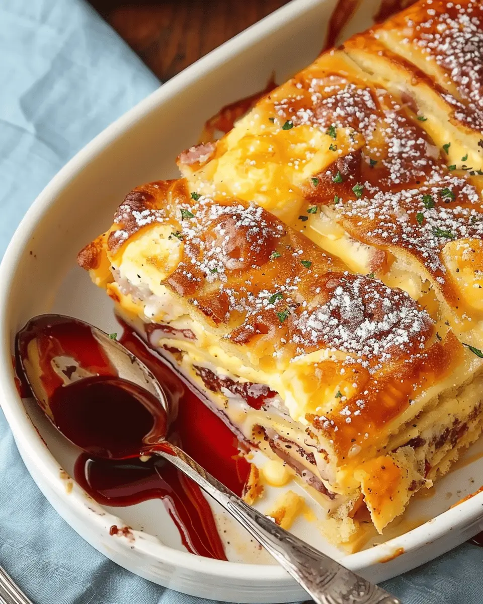 A comforting and indulgent casserole with layers of savory turkey bacon and a delightful twist on the classic Monte Cristo sandwich.