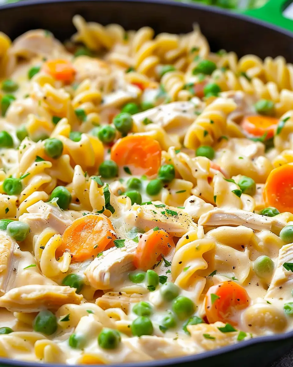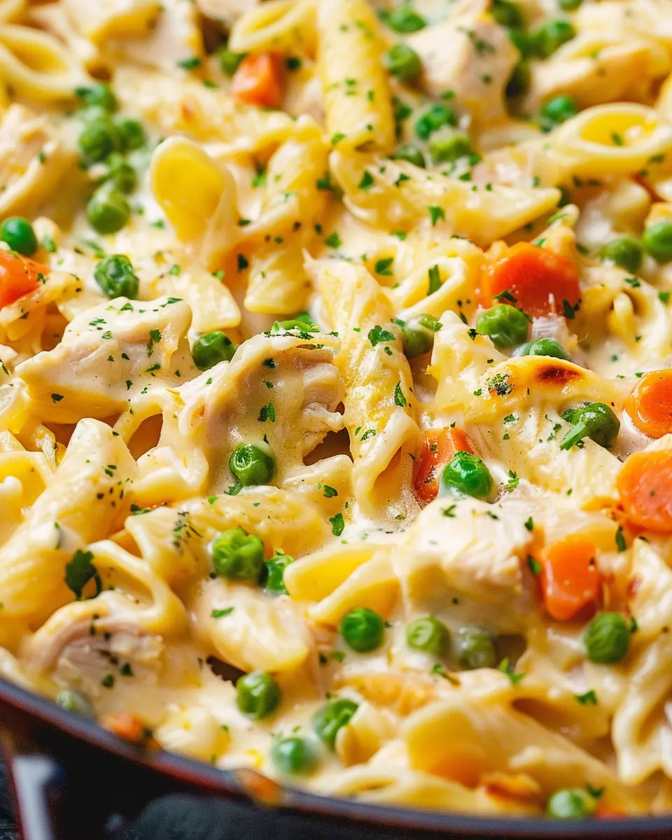 A comforting and creamy pasta dish that brings the flavors of chicken pot pie to your table.
