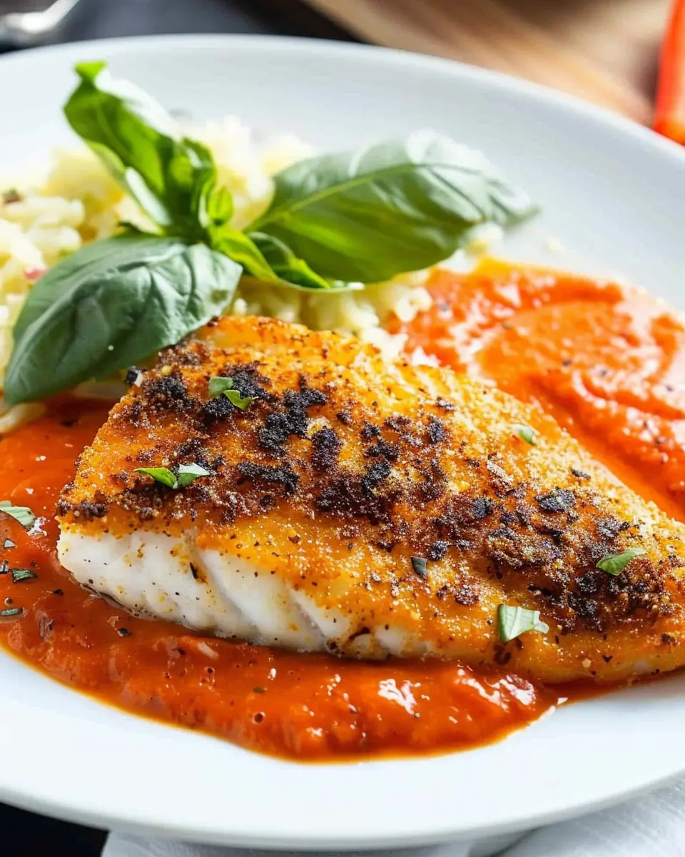 Before we tackle the fish, let’s kick things off with the star of the dish: the roasted red pepper sauce. This vibrant sauce melds beautifully with the Parmesan crust, adding a zesty kick that elevates the entire meal.