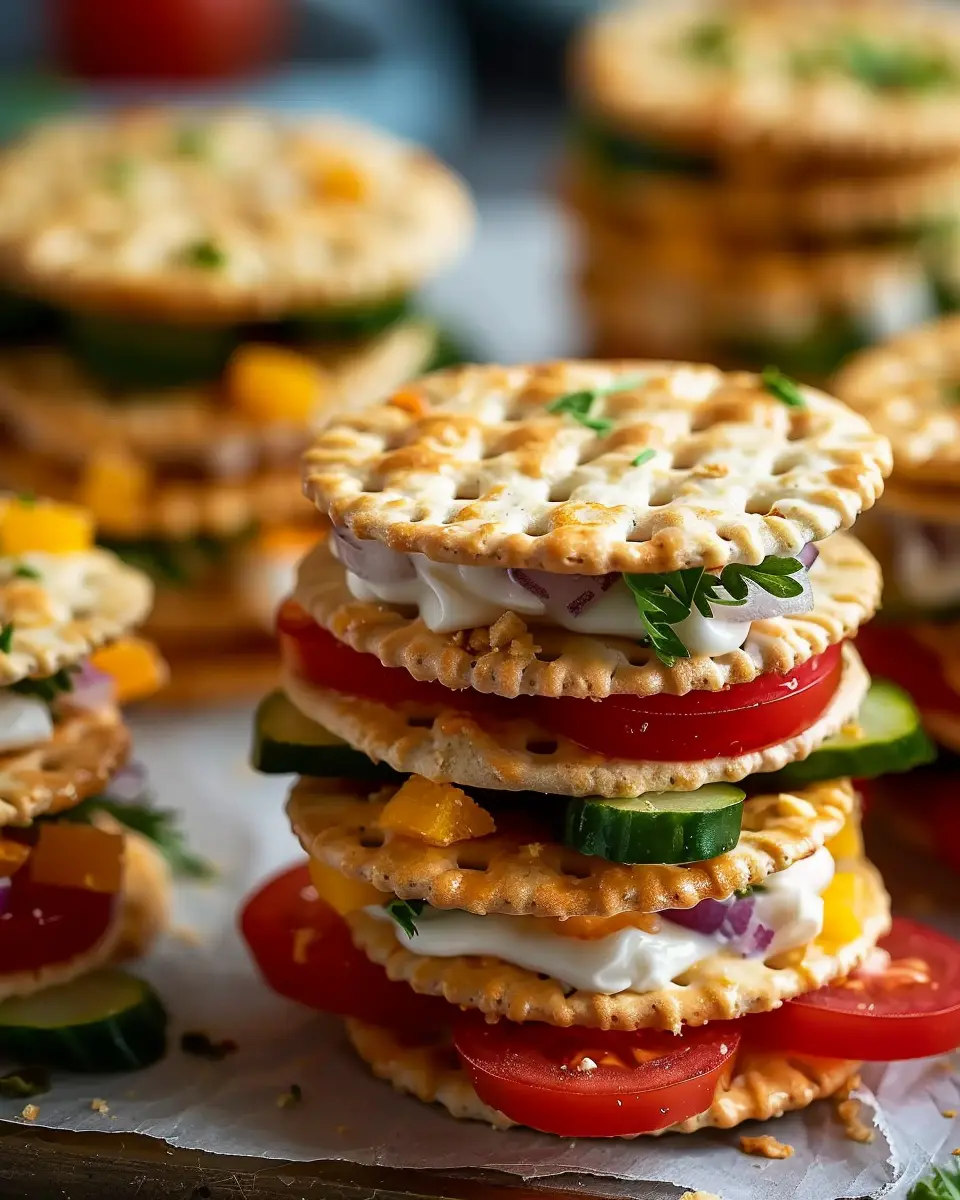 For a fresh and colorful option, try these veggie delight sandwiches! Layer cream cheese, fresh cucumbers, and red bell peppers between Ritz Crackers for a crunchy, vibrant bite. You could even add a dollop of hummus for an extra kick. The beauty of this recipe is in its flexibility—feel free to swap in your favorite veggies. Want to learn more about incorporating veggies into your snacks? Check out this guide on Healthy Snack Options.