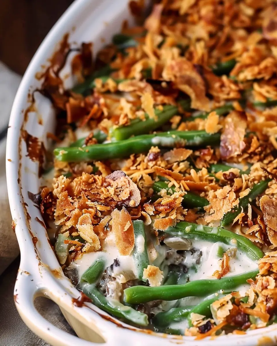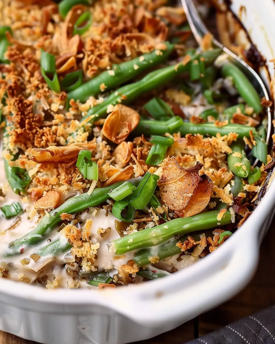 Experience the comfort of Southern Green Bean Casserole with a twist of turkey bacon, perfect for any gathering.
