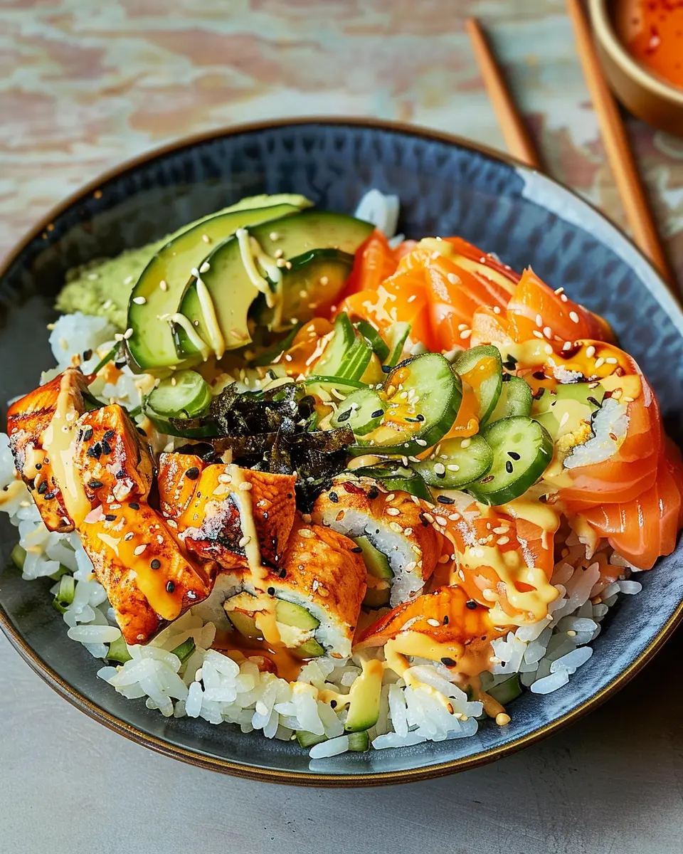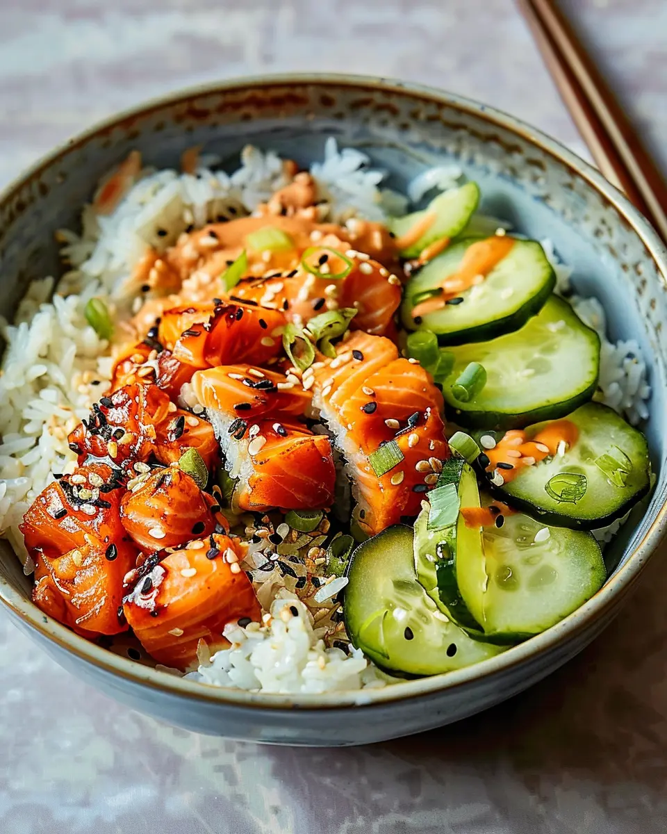 Creating an aesthetically pleasing spicy salmon roll bowl is all about layers and colors. Start by placing your rice as the base and artfully arrange your salmon, avocado, and veggies on top. Drizzle a spicy mayo or soy sauce for added flair and flavor. Garnish with sesame seeds and a sprinkle of chopped chives or cilantro for that final pop of color.
