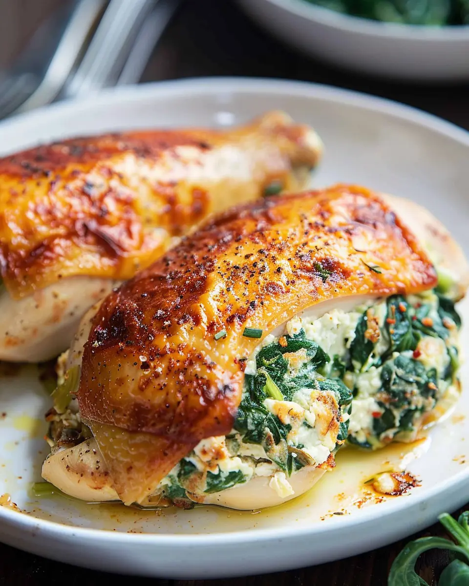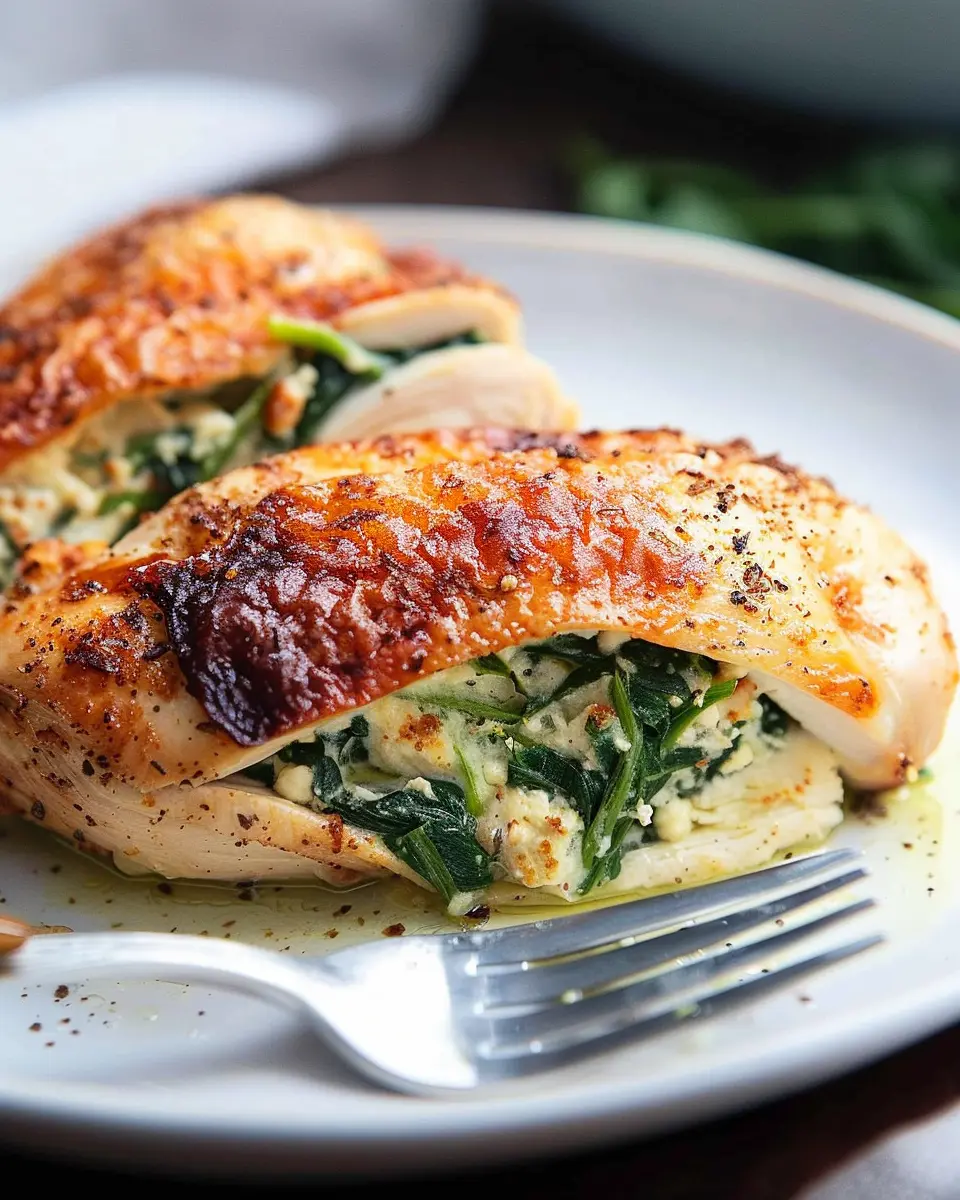 A delightful dinner option that is both simple to prepare and packed with flavor, featuring chicken breasts stuffed with spinach and cheese.