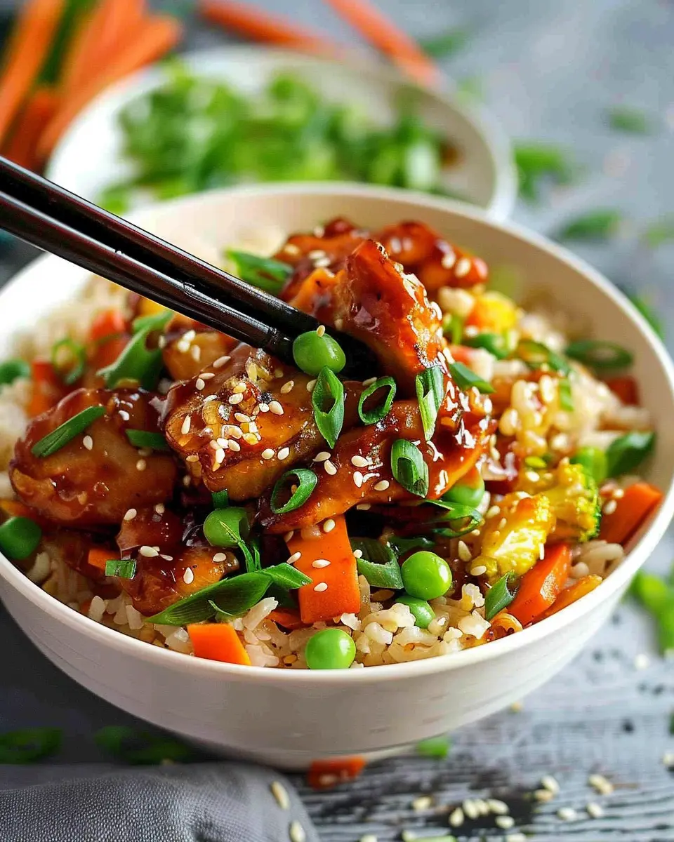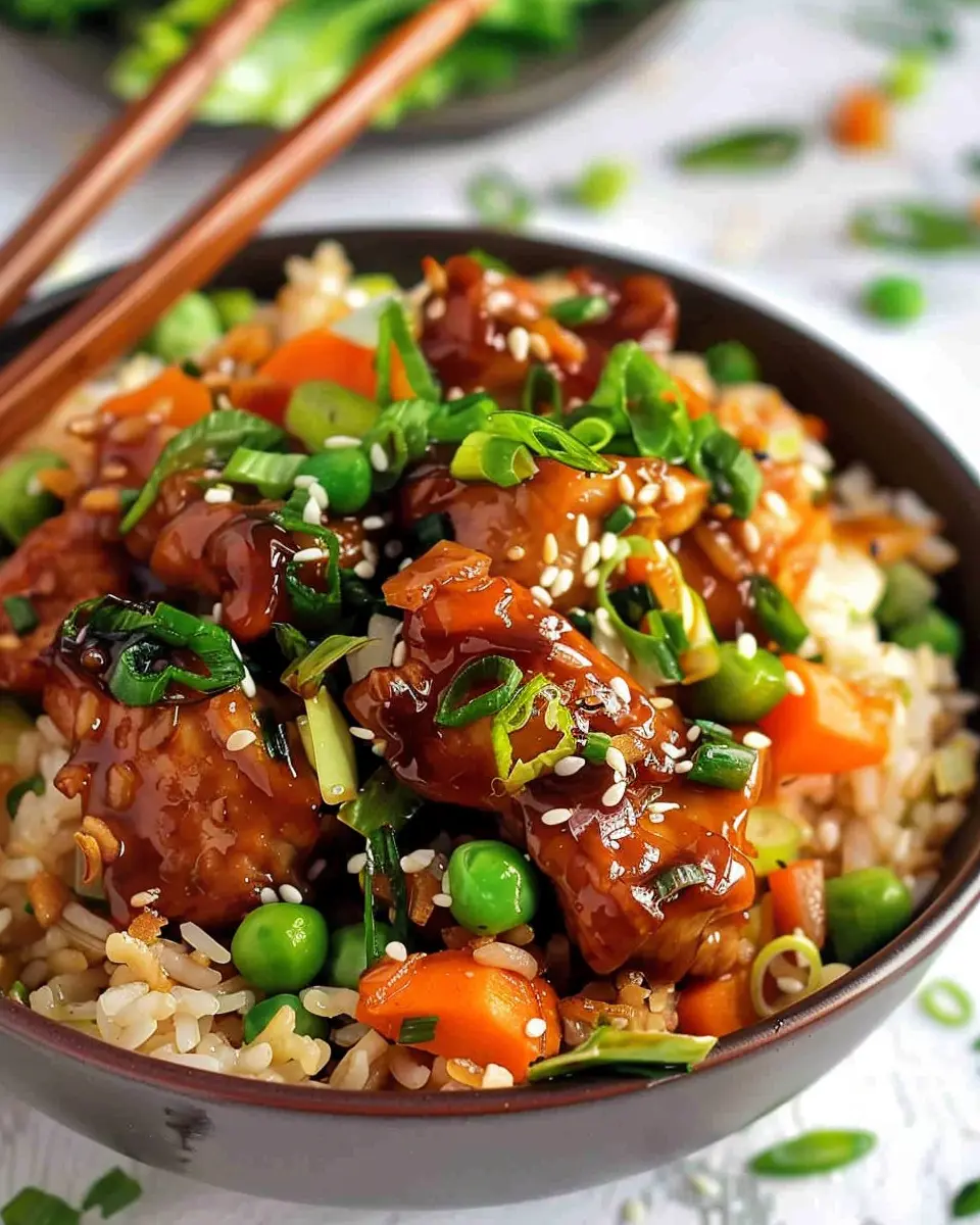 Absolutely! You can transform this sticky chicken with vegetable fried rice into a vegetarian meal by substituting the chicken with tofu or tempeh. Both options absorb flavors beautifully and provide a great protein boost. Additionally, you can enhance the flavor with vegetable broth instead of chicken broth when cooking the rice. Don’t forget to use vegetarian-friendly sauces to achieve that signature stickiness!